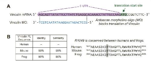 Vinculin tail in Human, Mouse, and Frog, highlighting that R1049 is conserved among the three