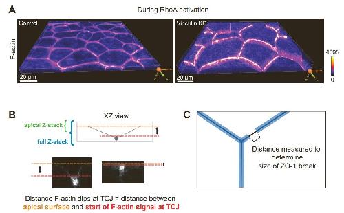 how distance F-actin dips at TCJs was calculated. “Apical surface” was determined as the
