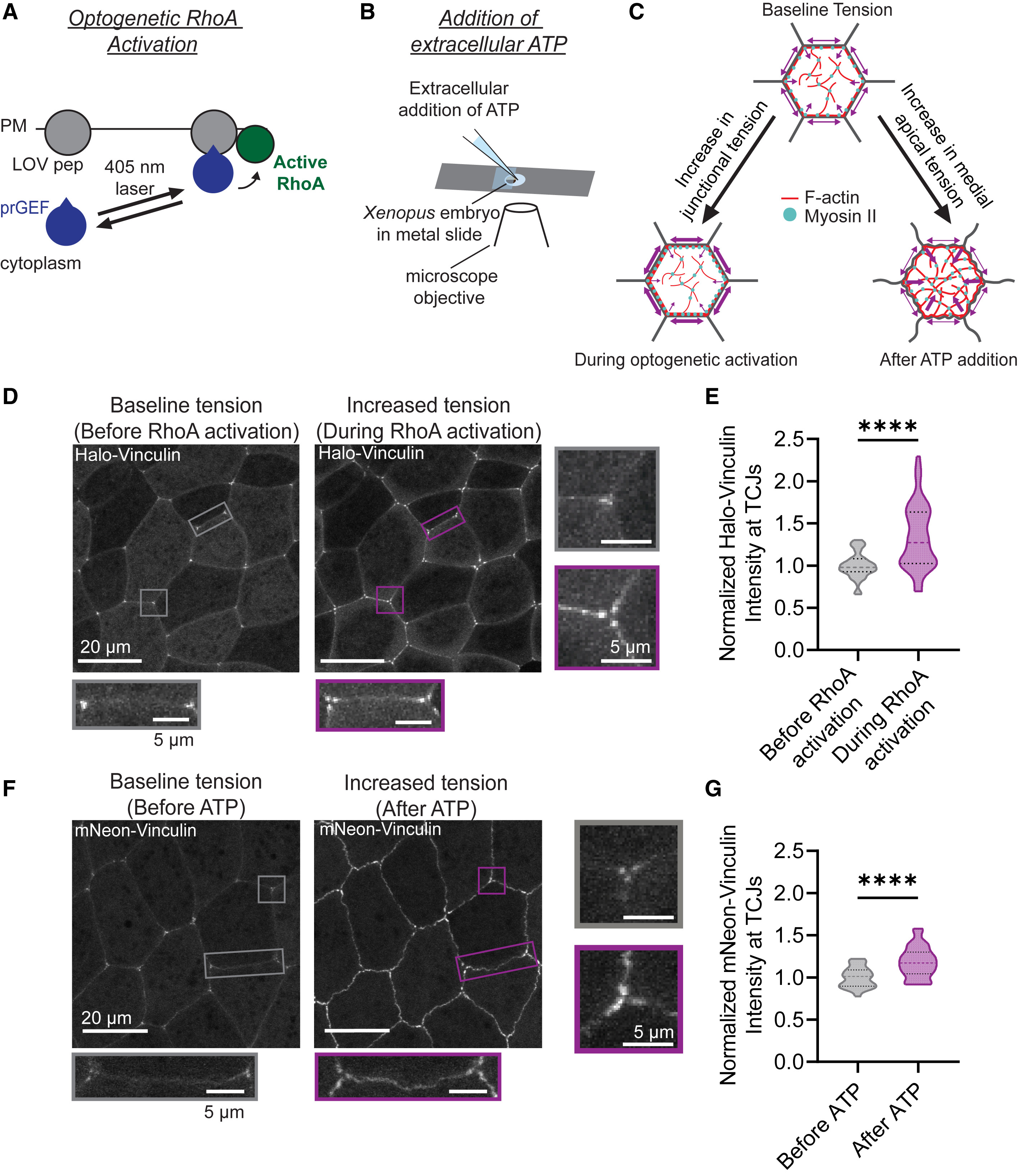 (G) Quantification of mNeon-Vinculin intensity at TCJs before and after ATP addition. Measured signal was normalized to cytosolic signal, and “before ATP” was set to 1. Statistics, paired t test; n = 3 experiments, 5 embryos, 29 TCJs; ∗∗∗∗p ≤ 0.0001. Violin plots show the median (dashed line) and the 25th and 75th quartiles (dotted lines).