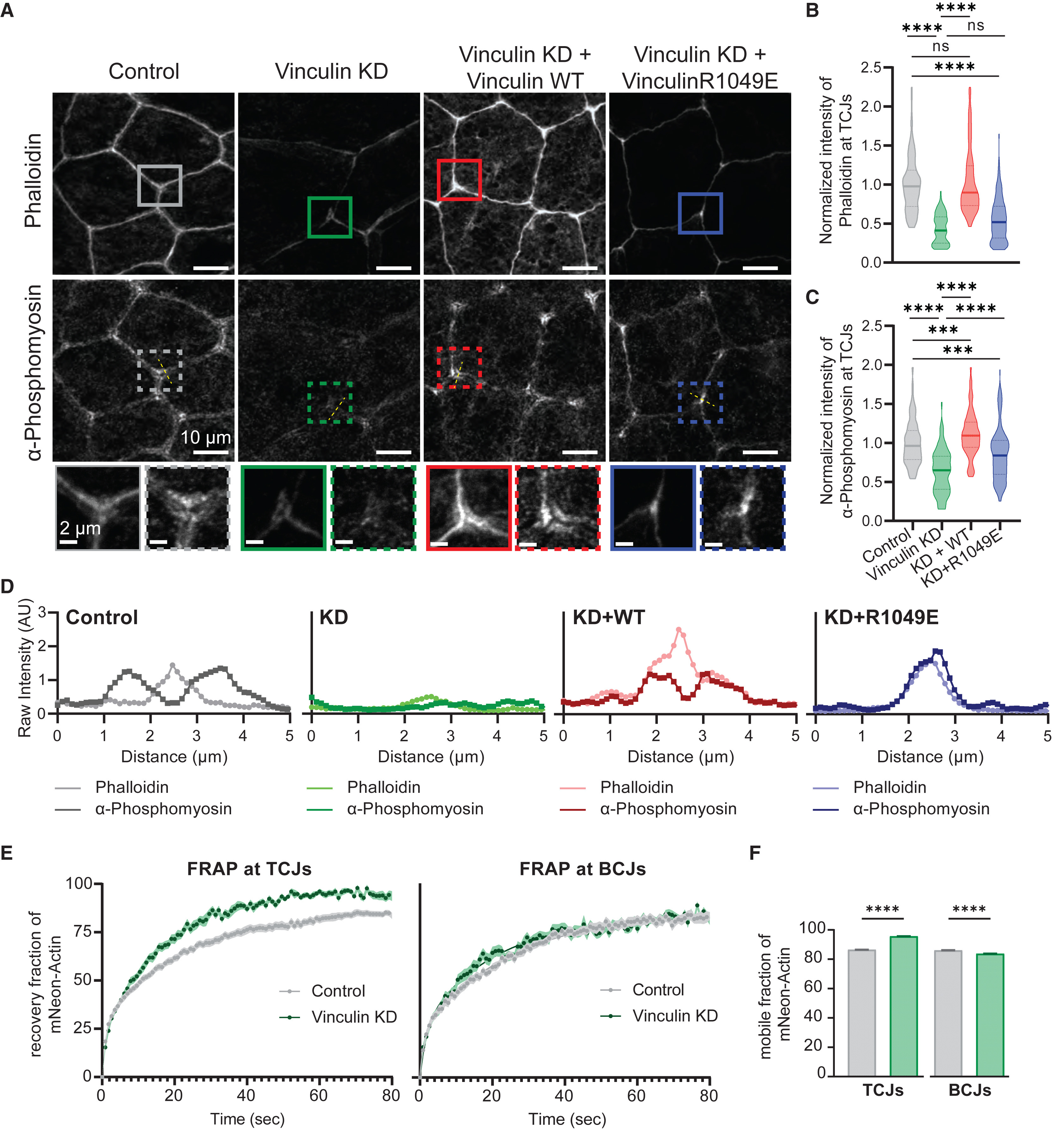 (D) Raw intensity line scans of phalloidin and α-phosphomyosin adjacent to TCJs in control, Vinculin KD, KD + WT, and KD + R1049E embryos. Locations of line scans are indicated by dashed yellow lines in (A).