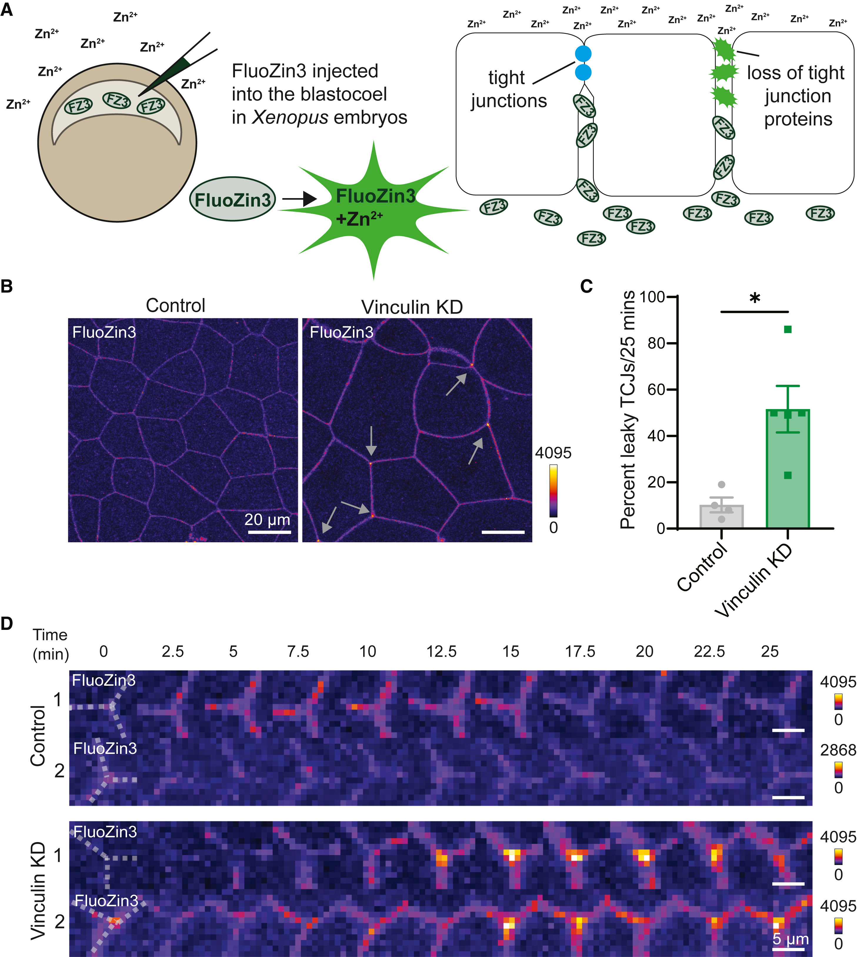 (D) Montages of FluoZin3 signal at representative TCJs in control and Vinculin KD embryos. Images are shown using the FIRE LUT; LUT adjustments are indicated for each montage.