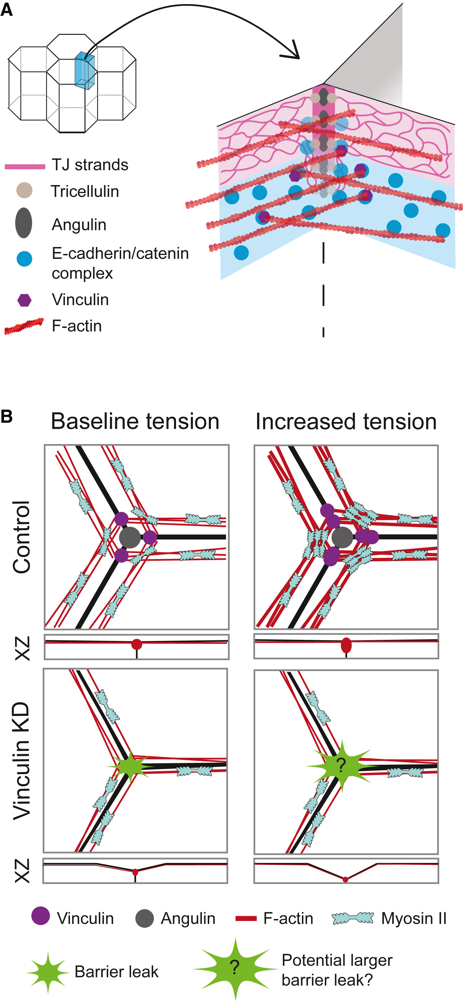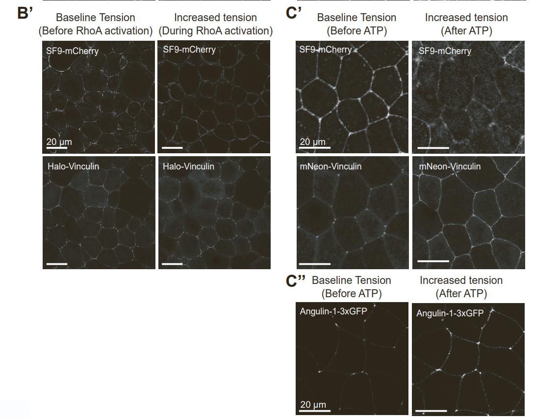Vinculin (mNeon-Vinculin) (C’), or the tTJ proteinAngulin-1 (Angulin-1-3xGFP) (C’’).