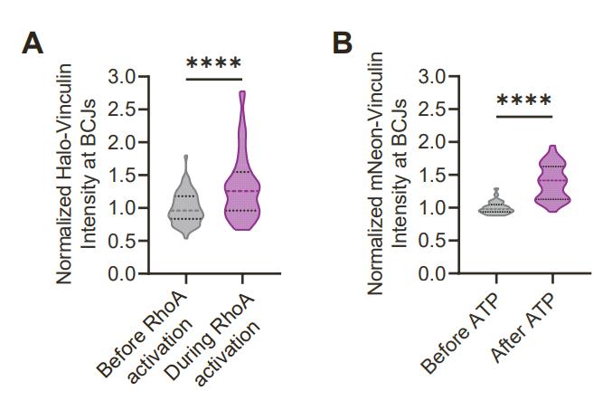 A) Quantification of normalized Halo-Vinculin intensity at BCJs before and during RhoA activation