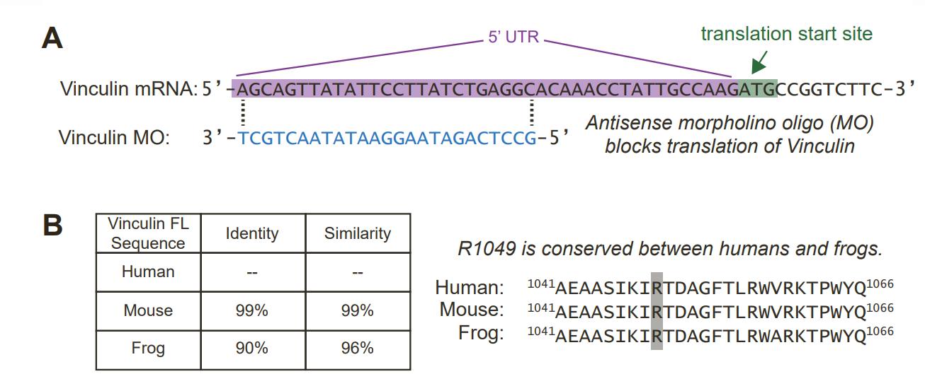 A) Schematic of the custom-designed Gene Tools Vinculin morpholino (Vinculin MO) which binds