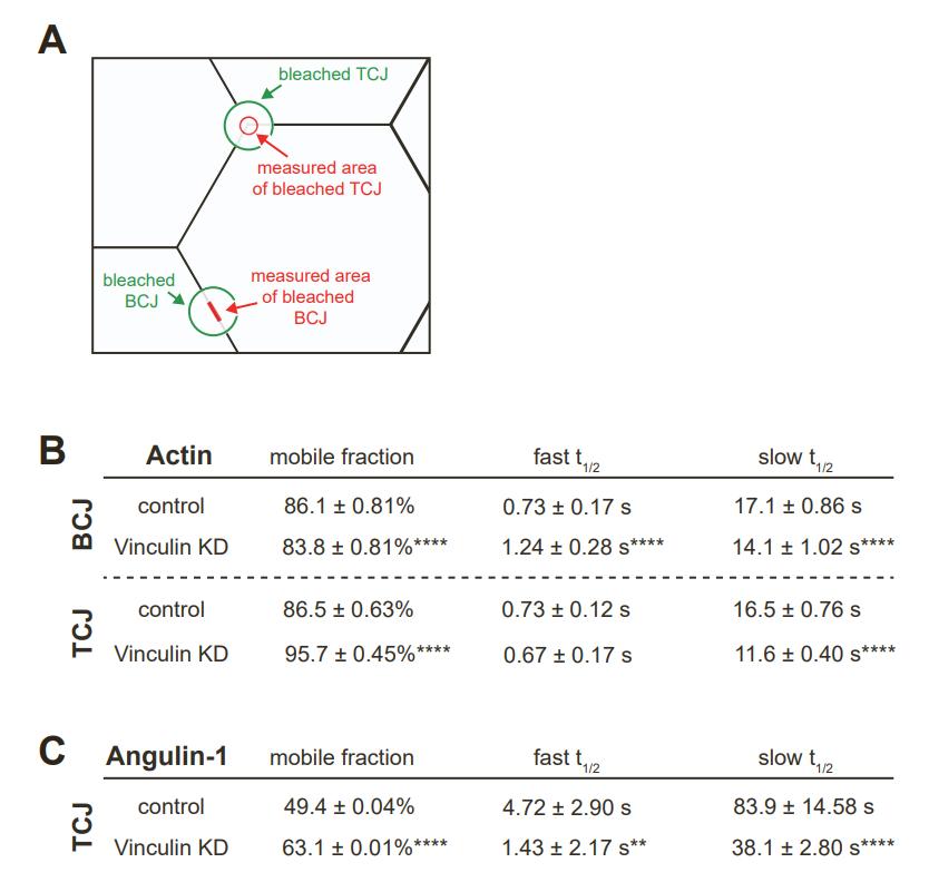 C) Table of measured mobile fractions and recovery rate values for Angulin-1-3xGFP FRAP at