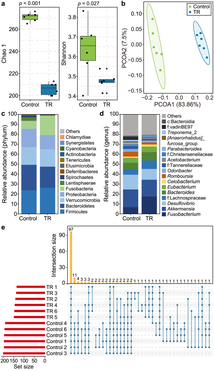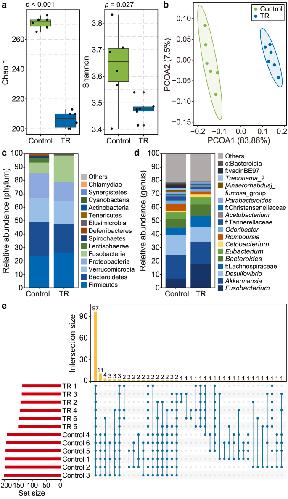 Fig. 2. Characterization of the gut microbial community in the biotoxin-exposed tadpoles. a–b, Analysis of the gut microbial community structure based on alpha (a) and beta (b) diversities. Significant differences were observed between the control (TR at 0 μg L−1) and TR-exposed groups (10 μg L−1). n = 6 replicates. c–d, Comparison of the gut microbial community composition between the control (TR at 0 μg L−1) and TR-exposed group (10 μg L−1) at the phylum (c) and genus (d) levels. n = 6 replicates. c and f indicate unassigned taxa at the taxonomic levels of class and family, respectively. e, UpSet plot of the gut microbial community in the TR-exposed (10 μg L−1) tadpoles at the genus level. The length of the red bars (bottom left) indicates the total size sets of the genera. The blue symbols, connected with blue lines, represent the intersections between the sets and the number. The yellow columns indicate the frequency of these intersections.