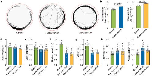 Fig. 4. Core gut pathobiome taxa responsible for the altered development and locomotor activity of the biotoxin-exposed tadpoles. a, Whole tracking of tadpoles recorded for 10 min is shown for the control group and those transplanted with Fusobacterium or Cetobacterium groups. b–c, Quantitative analysis of the colonization of Fusobacterium (b) and Cetobacterium (c) in the gut of the tadpoles after microbial transplantation. n = 3 replicates. d–g, Effects of the transplantation of Fusobacterium and Cetobacterium on the total length (d), body length (e), hindlimb length (f), and weight (g) of the tadpoles. n = 12 replicates. h–i, Effects of the transplantation of Fusobacterium and Cetobacterium on the swimming speed (h) and average activity (i) of the tadpoles. n = 19 for each. Different letters with error bars indicate a significant difference based on ANOVA with LSD test (p < 0.05).