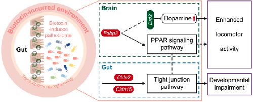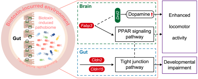 Fig. 6. Proposed schematic illustration of developmental and behavioral disorders mediated by biotoxin exposure-driven assembly of the gut pathobiome. The left panel of the figure shows that the biotoxin TR exposure drives the shift of the normal gut microbiome to the pathobiome, which causes developmental and behavioral disorders in the tadpoles. The detailed mechanism underlying the gut pathobiome-mediated disorder is shown in the right panel of the figure. In the reprogrammed transcriptome, a series of genes in the gut–brain axis involving fabp3, cldn2, cldn15, and drd2, differentially express and trigger the excitability of locomotor activity and morphogenesis impairment in tadpoles. The upregulated genes are indicated with red ellipses, and the downregulated genes are denoted with green. The red arrow demonstrates an increased level of dopamine.
