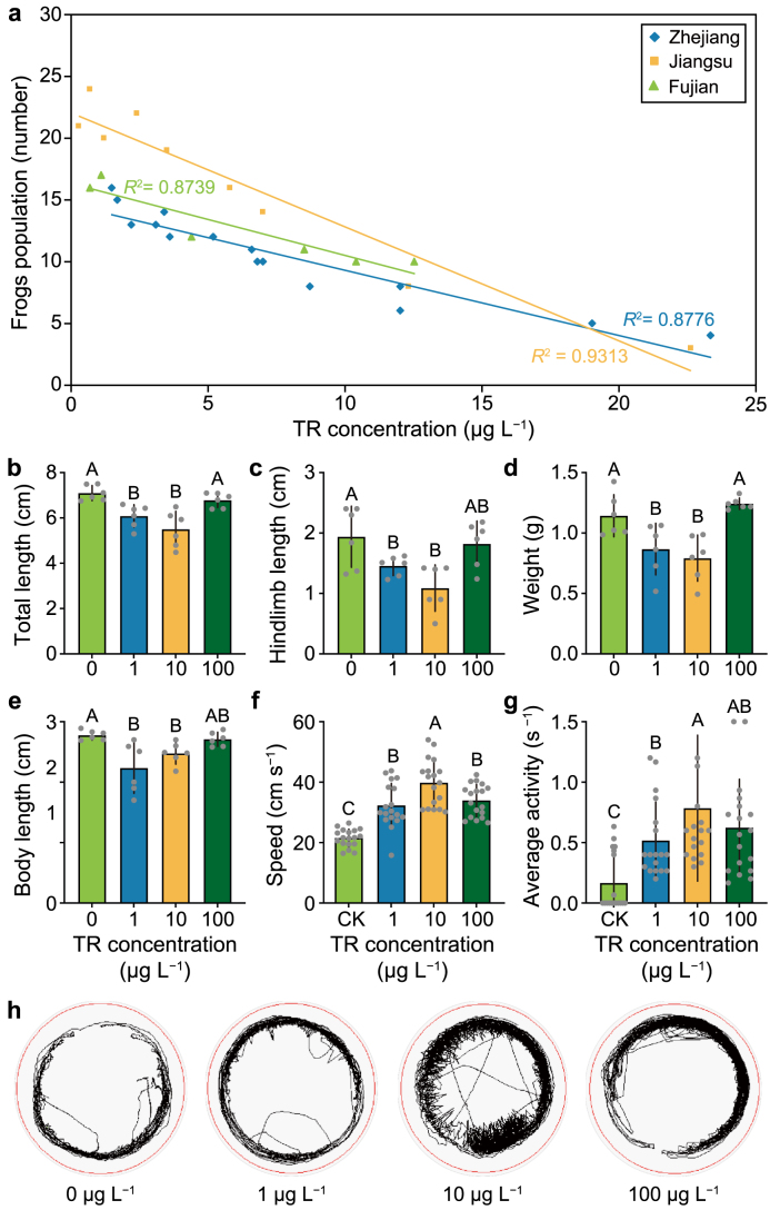 Fig. 1. Alterations in the density of frogs in paddy fields and development and locomotor activity of the tadpoles upon exposure to biotoxin. a, Regression analysis of the density of the frog population and the biotoxin tropolone (TR) levels in different region-specific rice paddies (Zhejiang, Jiangsu, and Fujian). b–e, Effects of biotoxin tropolone (TR) exposure (TR at 0, 1, 10, and 100 μg L−1) on the total length (b), hindlimb length (c), weight (d), and body length (e) of tadpoles (n = 6 replicates). f–g, Comparison of swimming speed (f) and average activity (g) of tadpoles in the control (CK: TR at 0 μg L−1) and TR-exposed groups (TR at 1, 10, and 100 μg L−1) (n = 18 replicates). h, Visualization of the swimming speed and average activity of tadpoles in the control (TR at 0 μg L−1) and TR-exposed groups (TR at 1, 10, and 100 μg L−1). The whole tracking of tadpoles recorded for 10 min is shown. Different letters with error bars indicate a significant difference based on a one-way analysis of variance (ANOVA) with least significant difference (LSD) test (p < 0.05).