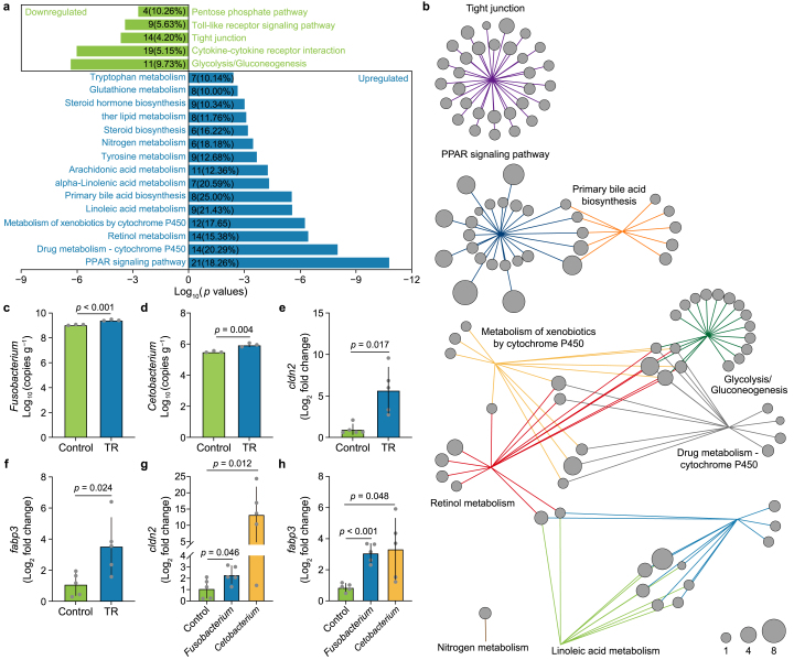 Fig. 5. Transcriptome reprogramming in the gut pathobiome-harboring tadpoles. a, KEGG pathways with enrichment of genes whose expression was significantly upregulated and downregulated genes in the TR-treated group (10 μg L−1), respectively. The number on the x-axis represents the p values of the enrichment of the KEGG pathway by log10-transformed. The quantity of DEGs in each enrichment pathway is exhibited by the numbers in the plot, and the proportion of all genes is also indicated in the pathway (in parentheses). b, Network analysis of the DEGs associated with the top ten KEGG enrichment pathways. The circle size denotes the relative fold change (log2-transformed) of gene expression. c–d, The colonization of Fusobacterium (c) and Cetobacterium (d) in the gut of the tadpoles upon exposure to 10 μg L−1 TR. n = 3 for replicates. e–f, The expressions of gene cldn2 (e) and fabp3 (f) in the TR-exposed tadpoles (10 μg L−1). n = 5 for replicates. g–h, The gene cldn2 (g) and fabp3 (h) expressions in the tadpoles fed with Fusobacterium and Cetobacterium, respectively. n = 5 for replicates. The values are presented as the means ± s.d. Student's t-test (two-tailed), p values were shown on the top of the paired columns.