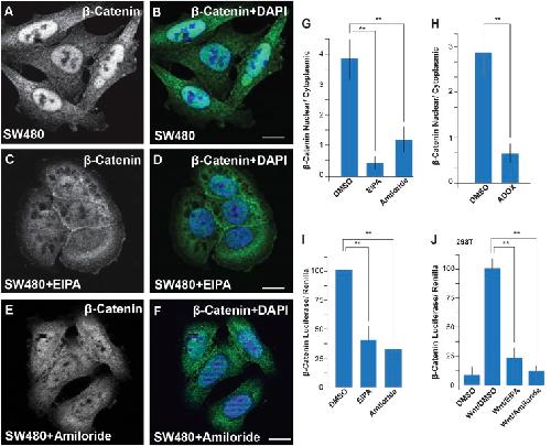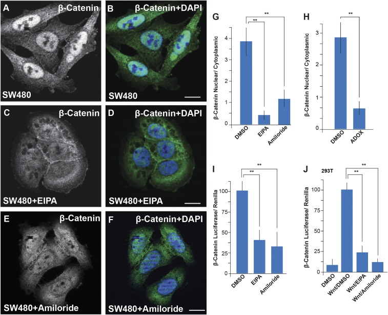 Fig. 5. Inhibitors of macropinocytosis or methylation decrease constitutive nuclear β-catenin accumulation in the colorectal cancer cell line SW480. (A–F) A marked reduction in nuclear β-catenin levels was caused by inhibiting macropinocytosis with EIPA or amiloride for 2 h. These agents inhibit macropinocytosis by blocking the plasma membrane Na+/H+ exchanger, resulting in acidification of cortical cytoplasm and inhibition of actin remodeling; amiloride is a diuretic that has been used in humans for over 50 y. (G) Quantification of β-catenin nuclear to cytoplasmic ratios, which were significantly reduced by EIPA or amiloride treatment (Materials and Methods). (H) Nuclear/cytoplasmic of β-catenin ratios were significantly reduced in SW480 cells treated with the methylation inhibitor Adox; corresponding immunofluorescence images are shown in SI Appendix, Fig. S5. (I) EIPA or amiloride treatment inhibited BAR Luciferase/Renilla activity in transiently transfected SW480 cells. (J) The macropinocytosis inhibitors EIPA or amiloride reduced Wnt3a signaling in HEK293T cells stably transfected with BAR/Renilla reporters. **P < 0.01. (Scale bars, 10 μm.)