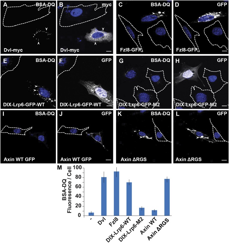 Fig. 2. Endocytosis and lysosomal degradation of BSA-DQ is increased by transfection of DNA constructs that activate the Wnt pathway. Untransfected cells serve as controls and are demarcated by a stippled line. (A and B) Fluorescence microscopy images showing that Dvl-myc overexpression increases endocytosis of BSA-DQ and degradation in HeLa cells (arrowheads); note that the untransfected cell has less BSA-DQ fluorescence than the transfected cell. (C and D) Overexpressed Wnt receptor Fz8 triggers BSA-DQ endocytosis (arrowheads). (E and F) Transfection of the fusion protein DIX-Lrp6-GFP, a strong activator of the Wnt pathway, triggered increased BSA-DQ endocytosis (arrowheads). (G and H) The control DIX-LRP6-GFP-M2 mutant, which has two mutations in the DIX domain of Dvl and is inactive in Wnt signaling (42), did not increase endocytosis. (I and J) Axin, an inhibitor of the Wnt pathway, did not affect endocytosis. (K and L) Dominant-negative Axin ΔRGS increased endocytosis of BSA-DQ (arrowheads). (M) Quantification of the activation of Wnt signaling by overexpression of a multiple-transfected DNA construct. Fluorescence per cell was quantified, as described in Materials and Methods analyzing a minimum of 25 transfected cells per condition. Untransfected NIH 3T3 cells are indicated by the minus (−) label. The M2 mutant DIX-Lrp6Ctail-M2 and Axin wild-type serve as negative controls that did not increase Wnt signaling nor endocytosis. (Scale bars, 10 μm.)
