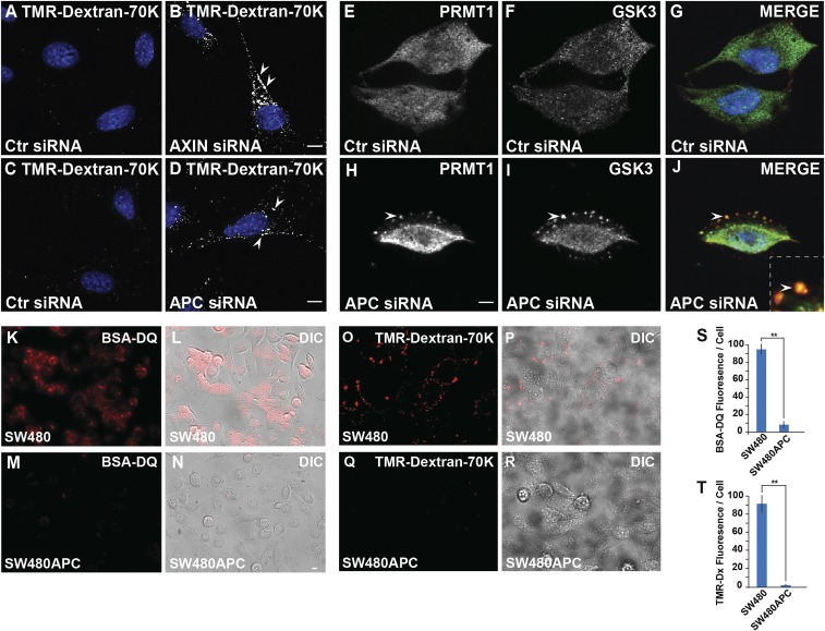 Fig. 3. Loss of function of the tumor suppressors Axin or APC trigger macropinocytosis of high molecular weight TMR-dextran 70 kDa, GSK3 and PRMT1 translocation to vesicles, and increased degradation of extracellular BSA protein in lysosomes. (A–D) Depletion of Axin or APC with siRNA triggered an increase in macropinocytosis marked by TMR-dextran 70 kDa in NIH 3T3 cells. Note that although Axin and APC are components of the β-catenin destruction complex, they also function as repressors of macropinocytosis. (E–J) APC induces localization of PRMT1 and GSK3 in vesicles in HeLa cells; GSK3 and PRMT1 sequestration are essential steps in canonical Wnt signaling. (K–N) Still images from Movie S2 showing that the colon cancer cell line SW480 had high BSA-DQ utilization within 30 min of addition, which was greatly reduced when full-length APC was restored in an isogenic cell line (SW480APC). (O–R) Similar experiment using the macropinocytosis tracer TMR-dextran 70 kDa. (S) Quantification of BSA-DQ digestion per SW480 or SW480APC cell. (T) Quantification of macropinocytosis of TMR-dextran 70 kDa in SW480 cells and its inhibition by restoration of APC. **P < 0.01. (Scale bars, 10 μm.)