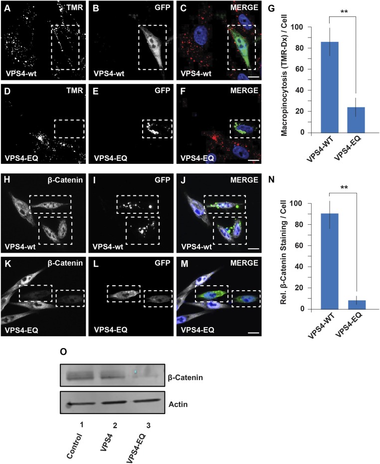 Fig. 4. The ESCRT machinery protein Vps4 is required for macropinocytosis and β-catenin nuclear accumulation in SW480 colorectal carcinoma cells. Vps4 is an ATPase, and the point mutation Vps4-EQ serves as a dominant-negative that prevents ESCRT machinery from recycling, therefore blocking microautophagy in late endosomes (44). (A–C) SW480 cells were transfected with Vps4-GFP and treated with the macropinocytosis marker TMR-dextran for 1 h; note that the cell which was transfected (indicated by a stippled square) had normal amounts of macropinocytosis. (D–F) Overexpression of dominant-negative Vps4-EQ blocked macropinocytosis of TMR-dextran, indicating that the ESCRT machinery function is required for macropinocytosis. (G) Quantification of the inhibitory effect of blocking the ESCRT machinery in transfected SW480 cells. (H–J) The SW480 cell line presents strong constitutive β-catenin staining that was unaffected by the overexpression of Vps4 (transfected cells indicated by stippled boxes). (K–M) Levels of β-catenin were greatly reduced in SW480 cells transfected with the dominant-negative Vps4-EQ (indicated by rectangles), but not in untransfected cells. (N) Quantification of the effect on β-catenin levels of blocking the ESCRT machinery in transfected cells. (O) Western blot showing that endogenous levels of β-catenin were reduced in dominant-negative Vps4-EQ transfected SW480 cells; actin serves as a loading control. **P < 0.01. (Scale bars, 10 μm.)