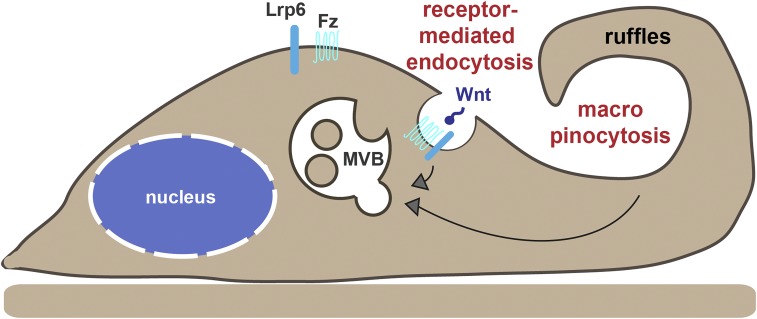 Fig. 6. Model of the effects of the growth factor Wnt in receptor-mediated endocytosis (micropinocytosis) and in receptor-independent endocytosis of proteins from extracellular fluids (macropinocytosis). The Wnt coreceptors Lrp6 and Fz are incorporated into receptor-mediated small microendocytic vesicles, triggering an as yet unknown signal that causes actin cytoskeleton remodeling in the lamellipodium at the leading edge of the cell, forming membrane ruffles and macropinocytic cups that engulf large amounts of the surrounding liquid. Both types of endosomes fuse into common MVBs/late endosomes that contain GSK3 and PRMT1 and require the ESCRT machinery for their formation. In the presence of Wnt, BSA incorporated by macropinocytosis is channeled to degradation in lysosomes, providing a source of nutrition for cells in which Wnt signaling is activated. The recycling of membrane from macropinocytic vesicles may help drive the considerable increase in microautophagy observed in MVBs/late endosomes shortly after Wnt treatment (8).