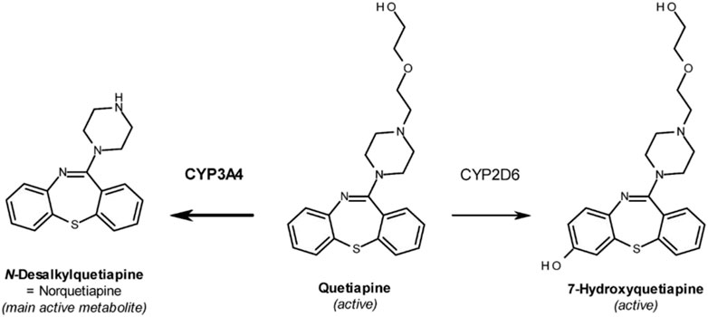 FIGURE 1. Chemical structures of Quetiapine (QTP) and its active metabolites Norquetiapine (NQTP) and 7-hydroxyquetiapine (7-OH QTP).