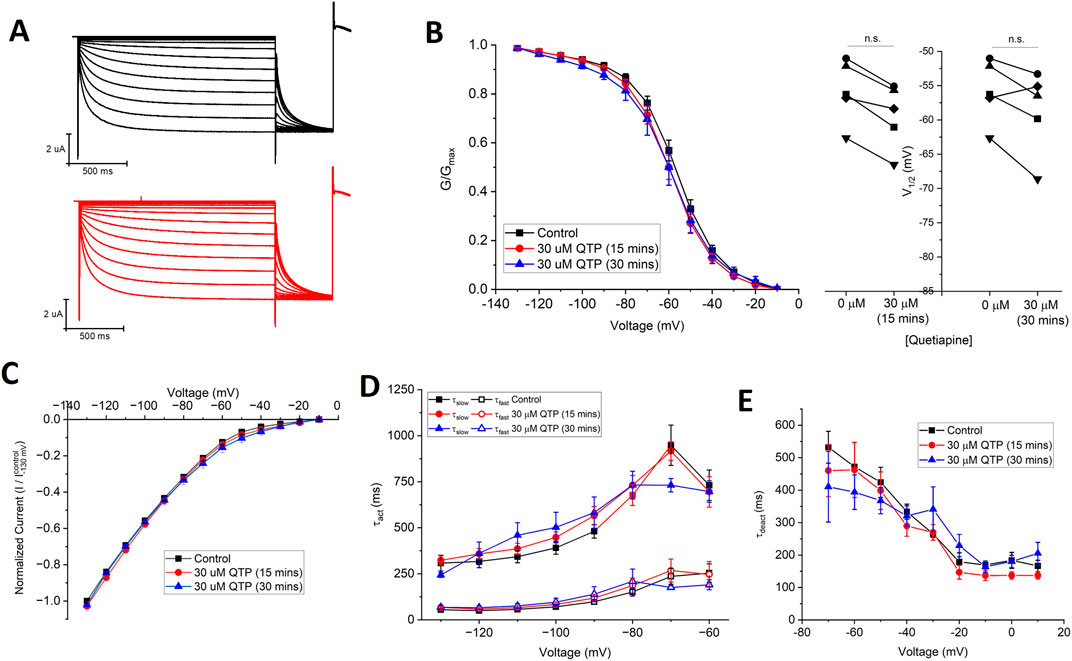 FIGURE 2. Quetiapine (QTP) does not regulate HCN1 channels. (A) Representative traces from a paired activation experiment following the addition of 30 µM QTP to oocytes expressing full-length HCN1. 30 μM QTP does not affect (B) the voltage-dependence of activation (V1/2 of each cell is shown on the right) (n = 5, P = 0.11) (C) the current-voltage (I-V) relationship (n = 5, P = 0.35) (D) activation kinetics (n = 5, P = 0.56) or (E) deactivation kinetics (n = 5, P = 0.72) of HCN1 channels.