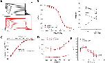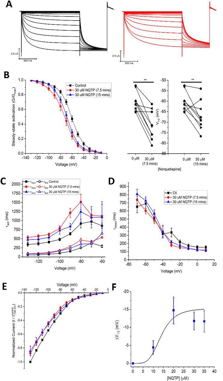 Figure 3. Norquetiapine (NQTP) inhibits HCN1 channels. (A) Representative traces from a paired activation experiment (control in black) following the addition of 30 µM NQTP (red traces) to oocytes expressing full-length HCN1. (B) NQTP induces a hyperpolarizing shift in the steady-state voltage-dependence of activation (P < 0.05 for V1/2 for 7.5 and 15 min compared to control). (C) Activation time constants (τfast and τslow) are greater in the presence of NQTP (P < 0.05). (D) Deactivation time constants (τdeact) are unchanged in presence of NQTP. (n = 6; P = 0.23). (E) Current-voltage (I-V) relationship in presence of NQTP normalized to maximal current (IControl (−130 mV)). (n = 9; P < 0.05 for 7.5 and 15 min compared to control). (F) Concentration dependence of ΔV1/2 fit with a Hill Equation 3 indicates NQTP inhibits HCN1 channels with an IC50 of 13.9 ± 0.8 μM, a maximum ΔV1/2 of −15.4 ± 1.2 mV and a Hill co-efficient of 4.2 ± 0.1.