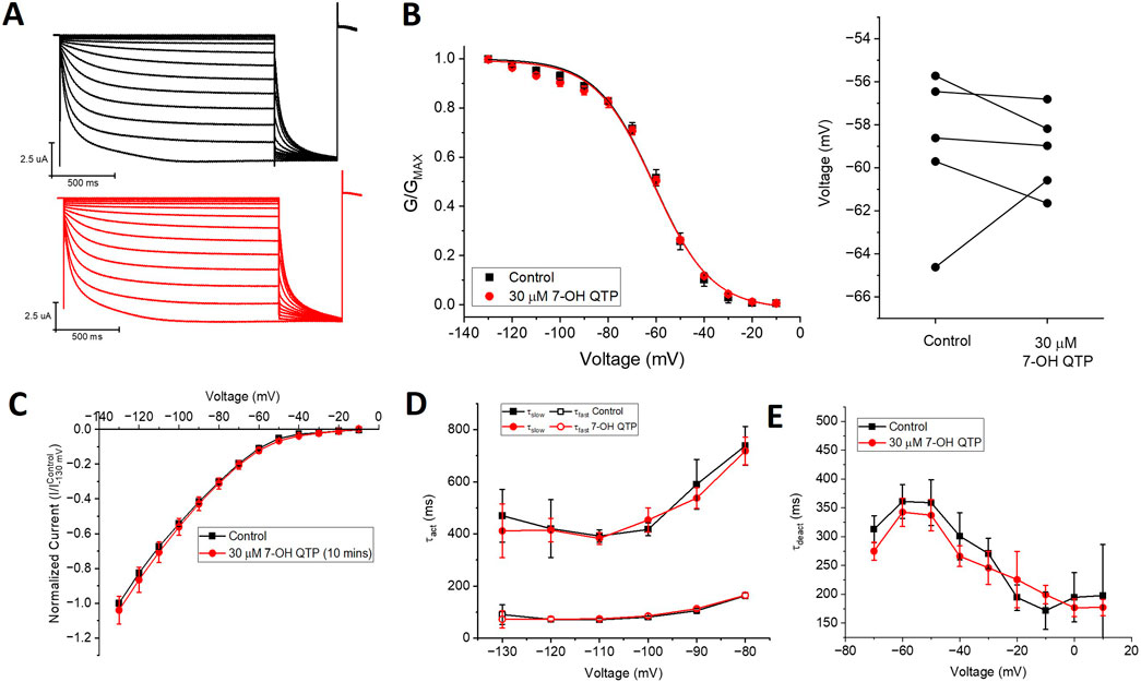 FIGURE 4. 7-hydroxyquetiapine (7-OH QTP) does not regulate HCN1 channels. (A) Representative traces from a paired activation experiment (control in black) following the addition of 30 µM 7-OH QTP (red traces) to oocytes expressing full-length HCN1. 30 μM 7-OH QTP does not affect (B) the voltage-dependence of activation (V1/2 of each cell is shown on the right) (n = 5, P = 0.64) (C), the current-voltage (I-V) relationship (n = 5, p = 0.47), (D) activation kinetics (n = 5, p = 0.88), or (E) deactivation kinetics (n = 6, P = 0.35) of HCN1 channels.