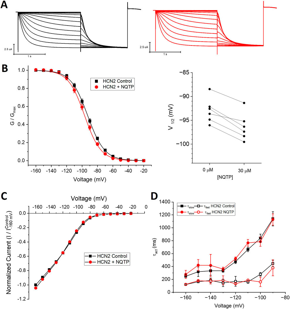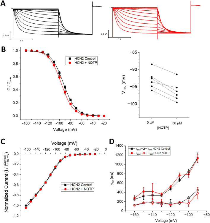 Figure 5. Norquetiapine (NQTP) does not inhibit HCN2 channels. (A) Representative traces from a paired activation experiment (control in black) following the addition of 30 µM NQTP (red traces) to oocytes expressing full-length HCN1. Unlike what we observe for HCN1 channels, 30 µM NQTP does not alter (B) the voltage-dependence of activation (V1/2 of each cell is shown on the right) (n = 6, P = 0.09), (C) the current-voltage (I-V) relationship (n = 6, p = 0.79) nor (D) the activation kinetics (n = 6, p = 0.65).