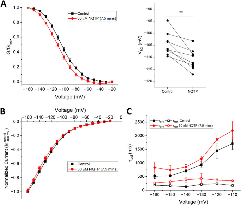 FIGURE 6. Norquetiapine (NQTP) inhibits HCN4 channels. (A) NQTP induces a hyperpolarizing shift in the steady-state voltage-dependence of activation (p < 0.05 for V1/2) (V1/2 of each cell is shown on the right) (n = 9, p = 0.001). (B) Current-voltage (I-V) relationship in presence of NQTP normalized to maximal current (IControl (-160 mV)). (n = 9; p = 0.63 for 7.5 min compared to control). (C) Activation time constants (τfast and τslow) are greater in the presence of NQTP (P < 0.05).