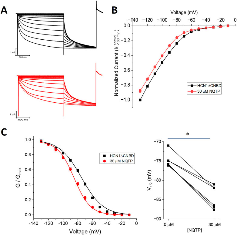 FIGURE 8. Norquetiapine (NQTP) inhibition of HCN1 channels does not depend on the CNBD. (A) Representative traces from a paired activation experiment (control in black) following the addition of 30 µM NQTP (red traces) to oocytes expressing HCN1ΔCNBD. (B) Current-voltage (I-V) relationship in presence of NQTP normalized to maximal current (Icontrol (-130 mV)). (n = 6; P < 0.05). (C) NQTP induces a hyperpolarizing shift in the steady-state voltage-dependence of activation (P < 0.05).