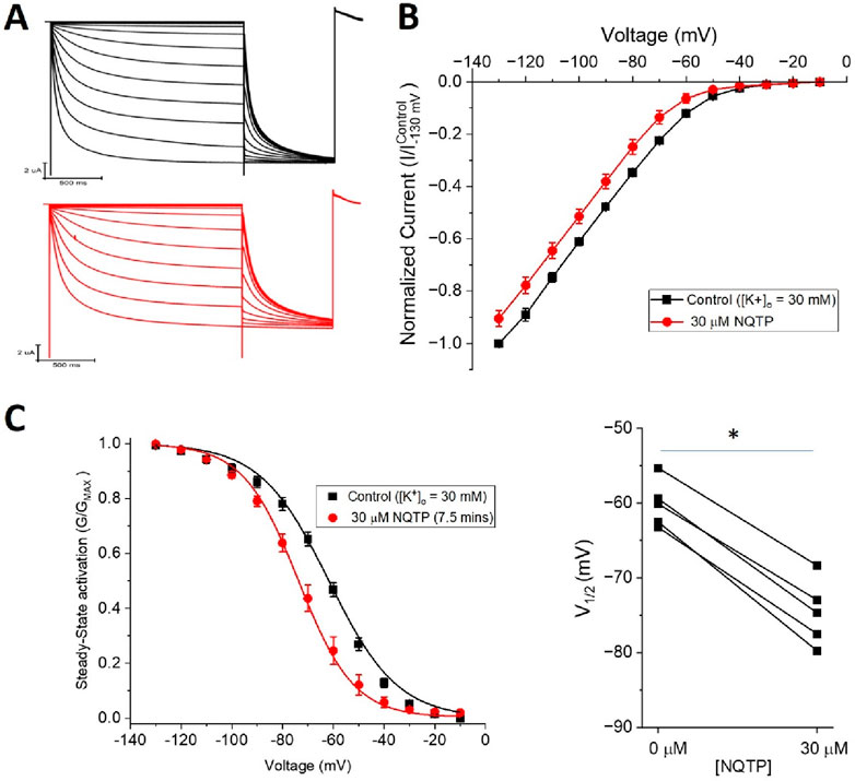FIGURE 9. Norquetiapine (NQTP) inhibition of HCN1 channels is not affected by increasing [K+]o. (A) Representative traces from a paired activation experiment following the addition of 30 µM NQTP (red traces) to oocytes expressing full-length HCN1 bathed in high external potassium (control in black). (B) Current-voltage (I-V) relationship in presence of NQTP normalized to maximal current (Icontrol (-130 mV)). (n = 6; P < 0.05). (C) NQTP induces a hyperpolarizing shift in the steady-state voltage-dependence of activation (P < 0.05 for V1/2).