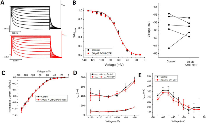 Figure 4. 7-hydroxyquetiapine (7-OH QTP) does not regulate HCN1 channels. (A) Representative traces from a paired activation experiment (control in black) following the addition of 30 µM 7-OH QTP (red traces) to oocytes expressing full-length HCN1. 30 μM 7-OH QTP does not affect (B) the voltage-dependence of activation (V1/2 of each cell is shown on the right) (n = 5, P = 0.64) (C), the current-voltage (I-V) relationship (n = 5, p = 0.47), (D) activation kinetics (n = 5, p = 0.88), or (E) deactivation kinetics (n = 6, P = 0.35) of HCN1 channels.