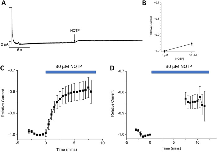Figure 7. State-dependence of norquetiapine (NQTP) inhibition of HCN1 channels. (A) Open-state block was assessed by a prolonged activation step to −130 mV and applying 30 µM NQTP at steady-state. (B) Relative current (INQTP/Icontrol) to be 0.95 ± 0.01 following NQTP treatment (n = 5; P < 0.05). (C) Closed-state block was assessed using a repetitive −130 mV/+30 mV pulse protocol every 30 s 30 μM NQTP was applied after the stabilization of HCN1 currents, and resulted in a decrease of current by 20.4% ± 1.1% (n = 7). (D) When the repetitive protocol is interrupted and cells are held at VH = −10 mV for 7.5 min during the application of NQTP the amount of inhibition that is induced is 15.8% ± 0.7% (n = 9) indicating NQTP is a closed state blocker of HCN1.