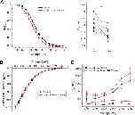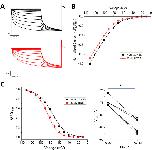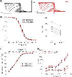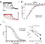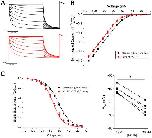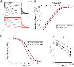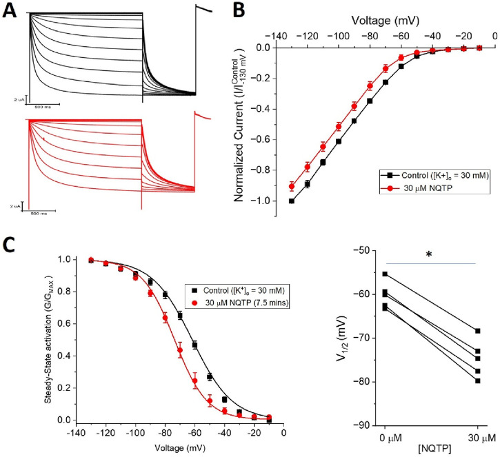 Figure 9. Norquetiapine (NQTP) inhibition of HCN1 channels is not affected by increasing [K+]o. (A) Representative traces from a paired activation experiment following the addition of 30 µM NQTP (red traces) to oocytes expressing full-length HCN1 bathed in high external potassium (control in black). (B) Current-voltage (I-V) relationship in presence of NQTP normalized to maximal current (Icontrol (-130 mV)). (n = 6; P < 0.05). (C) NQTP induces a hyperpolarizing shift in the steady-state voltage-dependence of activation (P < 0.05 for V1/2).