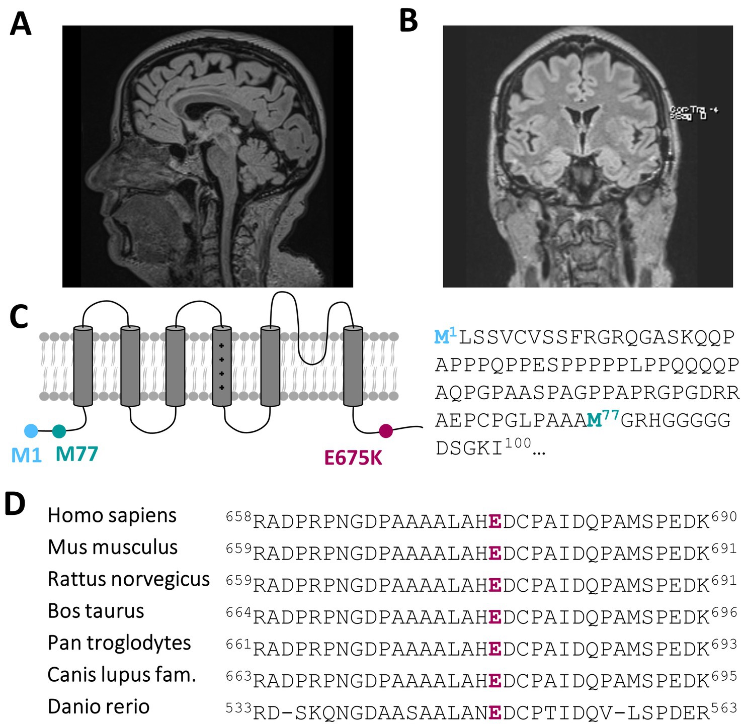 Figure 1. A heterozygous KCNC3 variant in an atypical case of SCA13 with a dominant central rotational vertigo, only mild progressive cerebellar symptoms and an early onset of cognitive impairment. (A) Mid-sagittal T1/T2 and Flair-sequence MR image of the patient in 2024 showing a mild cerebellar atrophy and (B) a global reduction of brain volume. (C) Topology of a Kv3.3 channel subunit. The location of the E675K variant is highlighted in purple and the location of the alternative start of the N-terminus is highlighted in turquoise. (D) Partial amino acid sequence alignment of different Kv3.3 orthologues. The conserved E675 residue is highlighted in purple.