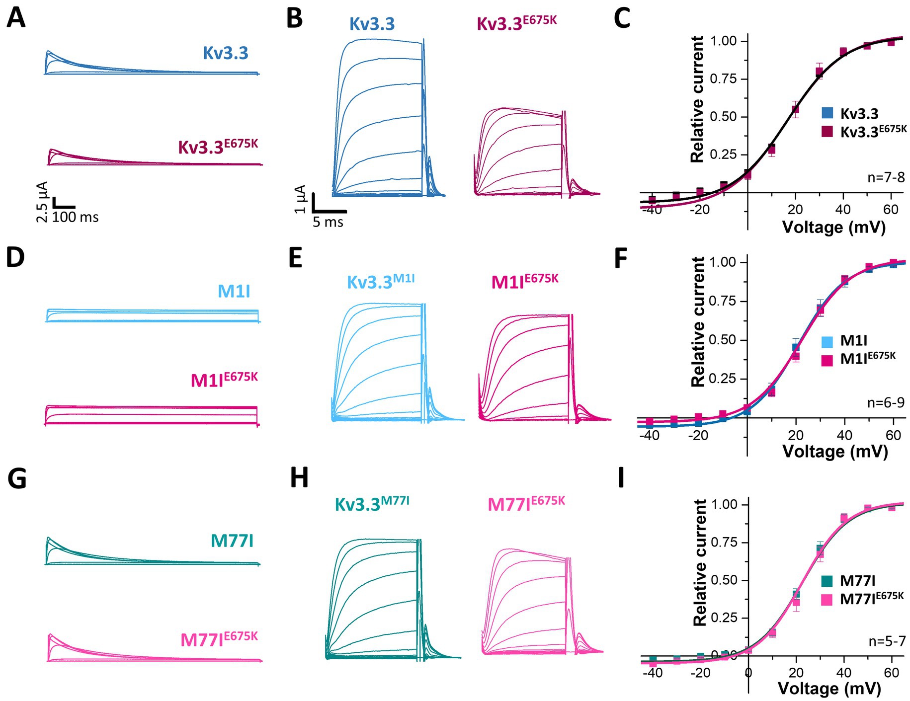 Figure 2. Voltage-dependence of activation of Kv3.3 and the Kv3.3E675K variant in different channel backgrounds. (A) Representative current traces of wild-type Kv3.3 (top) and Kv3.3E675K (bottom). The voltage protocol is illustrated in Supplementary Figure 5B. (B) Representative current traces using a short GV protocol (see Methods section and Supplementary Figure 5A) and (C) the conductance-voltage relationships derived from panel (B). (D–F) The same as in panel (A–C), but the E675K variant was studied in a forced short Kv3.3 channel (M1I mutant). (G–I) The same as in panel (A–C), but the E675K variant was studied in the in a forced long Kv3.3 channel (M77I mutant). Data are presented as mean ± s.e.m. The number of replicates is indicated within the graphs.