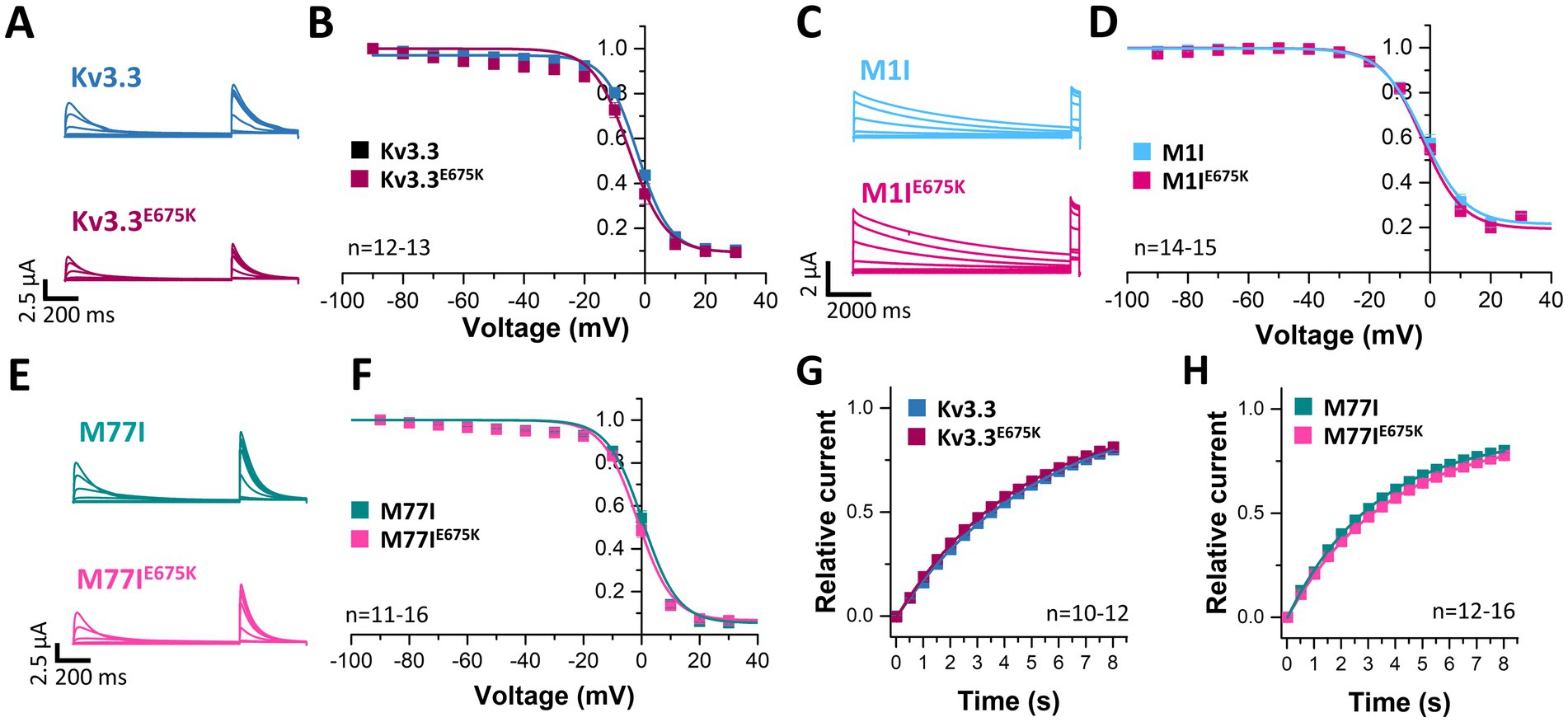 Figure 3. Voltage-dependence of inactivation and recovery from inactivation kinetics of Kv3.3 and the Kv3.3E675K variant in different channel backgrounds. (A) Representative current traces of wild-type Kv3.3 (top) and Kv3.3E675K (bottom) (The voltage protocol is illustrated in Supplementary Figure 5C) and (B) the derived inactivation curves. (C,D) The same as in panel (A,B), but the E675K variant was studied in a forced short Kv3.3 channel (M1I mutant) (The voltage protocol is illustrated in Supplementary Figure 5D). (E,F) The same as in panel (A,B), but the E675K variant was studied in the in a forced long Kv3.3 channel (M77I mutant). (G) Recovery from inactivation of wild-type Kv3.3 and Kv3.3E675K, fitted to a mono-exponential equation. The voltage protocol is illustrated in Supplementary Figure 5F. (H) The same as in panel (G), but the E675K variant was studied in the in a forced long Kv3.3 channel (M77I mutant). Data are presented as mean ± s.e.m. The number of replicates is indicated within the graphs.