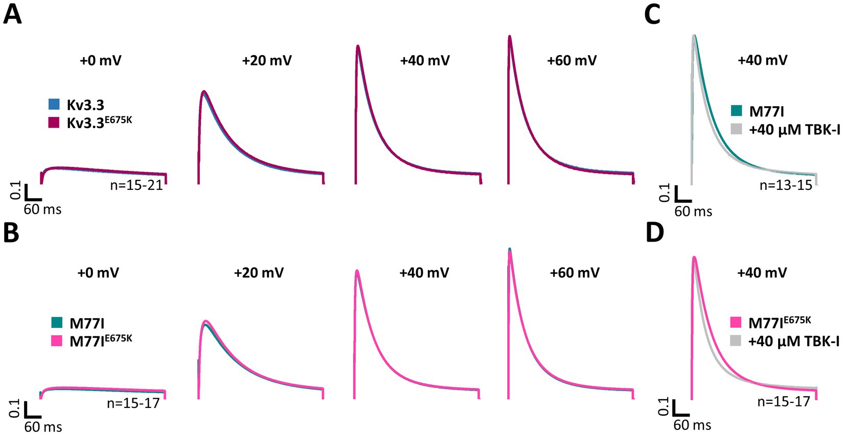 Figure 4. Inactivation kinetics and TBK1 modulation of Kv3.3 and the Kv3.3E675K variant. (A) Averaged current traces to illustrate the voltage-dependence of activation and the inactivation kinetics at different potentials for wild-type Kv3.3 and Kv3.3E675K (The voltage protocol is illustrated in Supplementary Figure 5B). (B) Similar as in panel (A) but the E675K variant was studied in the in a forced long Kv3.3 channel (M77I mutant). (C) Averaged current traces to illustrate the inactivation kinetics of the forced long Kv3.3 channel (M77I mutant) without or after pre-treatment with a TBK1 inhibitor. The time constants of inactivation of the M77I Kv3.3 channel after TBK1 inhibitor treatment were: τ1 = 144 ms, τ2 = 50 ms, A1/(A1 + A2) = 0.3. (D) The same as in panel (C), but for the forced long variant carrying the E675K variant. The time constants of inactivation of the M77I Kv3.3E675K variant after TBK1 inhibitor treatment were: τ1 = 136, τ2 = 43, A1/(A1 + A2) = 0.3. The number of replicates is indicated within the graphs.
