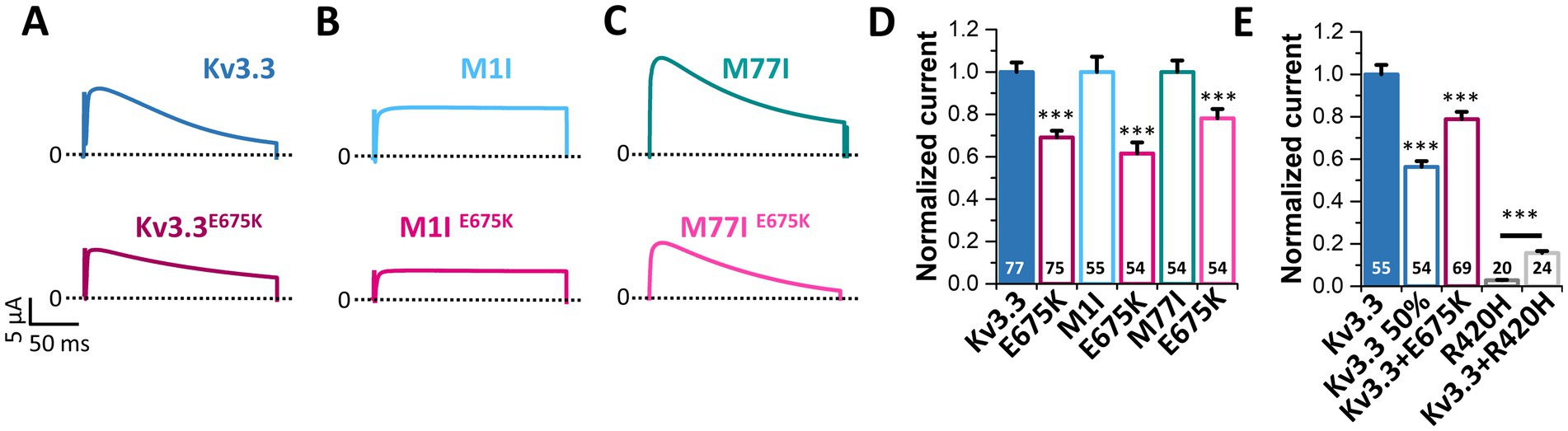 Figure 5. The Kv3.3E675K variant reduces the current amplitudes of Kv3.3 channels. (A) Representative current traces of Kv3.3 and the E675K variant introduced in wild-type Kv3.3. The voltage protocol is illustrated in Supplementary Figure 5E. (B) The same as in panel (A) but the E675K variant was introduced in the forced short M1I Kv3.3 channel or (C) the forced long M77I Kv3.3 channel background. (D) Peak current amplitude analyses derived from panel (A–C). Plotted are the current amplitudes of the respective Kv3.3 channel constructs, in the absence or presence of the E675K variant. Currents were analyzed after a voltage step to +50 mV, 2 days after injection of 0.5 ng cRNA of the respective channel construct into each oocyte. Currents were normalized to the respective Kv3.3 channel background. (E) Oocytes were injected with 0.5 ng (Kv3.3) or to mimic a haploinsufficiency with 0.25 ng (Kv3.3 50%) wild-type Kv3.3 cRNA. To mimic the heterozygous state of the patient, 0.25 ng wild-type Kv3.3 was co-injected with 0.25 ng Kv3.3E675K cRNA (Kv3.3 + E675K). As a comparison to a SCA13 mutant, we injected 0.5 ng cRNA of the dominant-negative Kv3.3R420H mutant (Kv3.3R420H) alone or 0.25 ng wild-type Kv3.3 together with 0.25 ng Kv3.3R420H. Currents were analyzed as in panel (D) and normalized to wild-type Kv3.3. Data are presented as mean ± s.e.m. The number of replicates is indicated within the graphs.