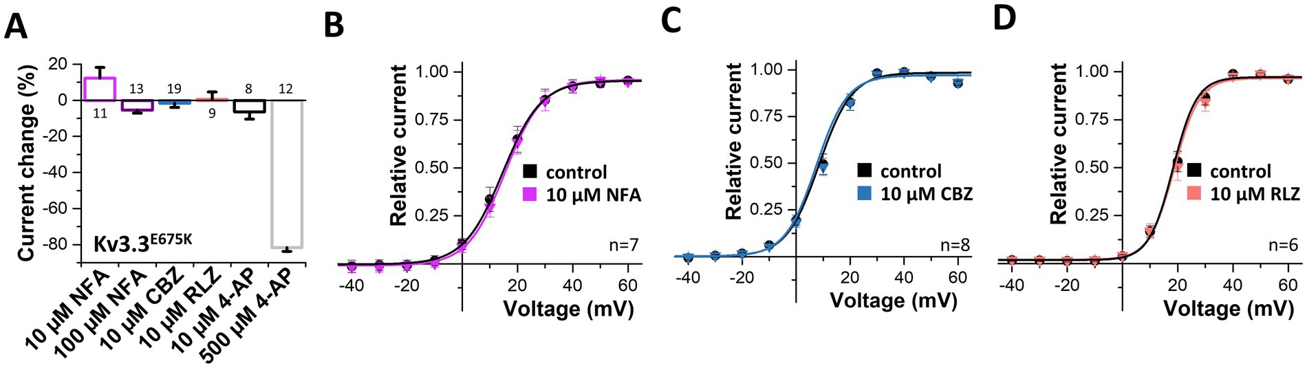 Figure 6. Search for drugs to rescue the Kv3.3E675K-mediated loss-of-function. (A) Analysis of the current changes of the Kv3.3E675K variant by the application of niflumic acid (NFA), carbamazepine (CBZ), riluzole (RLZ) or 4-AP, analyzed at +40 mV. (B) Conductance-voltage relationships before and after perfusion with 10 μM niflumic acid, (C) 10 μM carbamazepine or (D) 10 μM riluzole. The voltage protocol is illustrated in Supplementary Figure 5A. Data are presented as mean ± s.e.m. The number of replicates is indicated within the graphs.