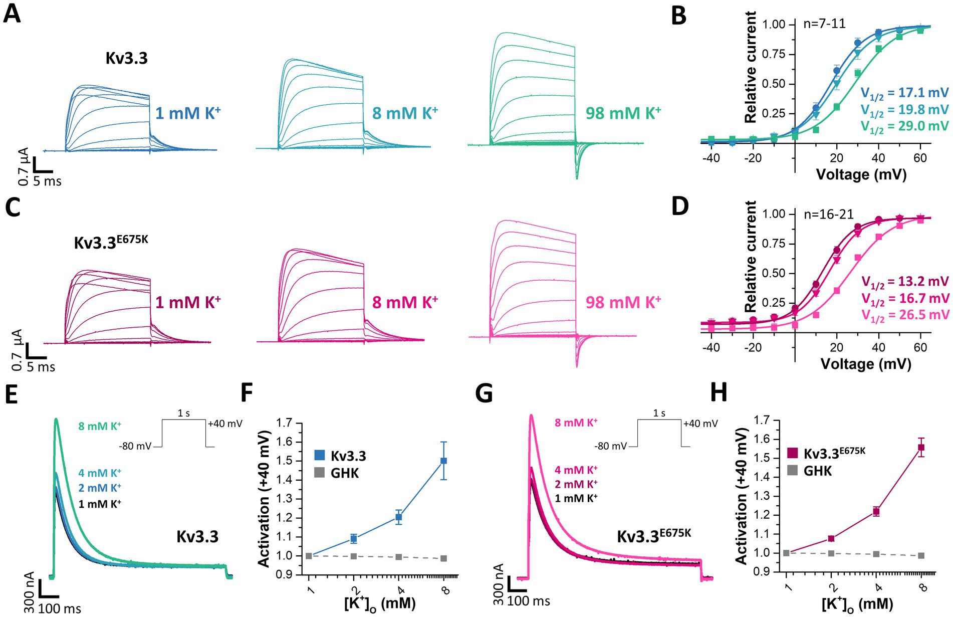 Figure 7. Rescue of Kv3.3 and Kv3.3E675K, by increased peak current amplitudes and reduced channel inactivation, mediated by [K+]ex. (A) Representative conductance-voltage (GV) recordings of Kv3.3 at different [K+]ex and (B) the derived GV relationships, analyzed from the tail currents at different [K+]ex. (C,D) Similar as in panel (A,B) but for the Kv3.3E675K variant. The voltage protocol is illustrated in Supplementary Figure 5A with a step to −15mV, −25mV and −40 mV, respectively. (E) A voltage step from −80 to +40 mV (see inset) was applied to record channel activation and peak currents of wild-type Kv3.3 at different [K+]ex. (F) Analysis of wild-type Kv3.3 channel activation at +40 mV by different [K+]ex. As a comparison to illustrate the paradoxical Kv3.3 activation by [K+]ex, the expected current changes, according to the Goldmann-Hodgkin-Katz equation, are illustrated as dotted line. (G,H) Similar as panel (E,F) but for the Kv3.3E675K variant. Data are presented as mean ± s.e.m. The number of replicates is indicated within the graphs.