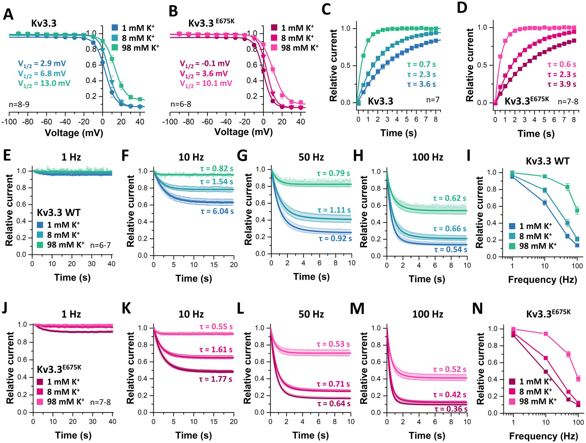 Figure 8. Rescue of Kv3.3 and Kv3.3E675K, by a shift in the voltage-dependence of inactivation, speeding of the recovery from inactivation and a reduced cumulative inactivation, mediated by [K+]ex. Inactivation curves of (A) Kv3.3 or (B) Kv3.3E675K at different [K+]ex. The V1/2 of inactivation for the different [K+]ex are provided within in the graphs. The voltage protocol is illustrated in Supplementary Figure 5C. (C) Recovery from inactivation of Kv3.3 or (D) Kv3.3E675K at different [K+]ex. The time constants τ for the recovery from inactivation are calculated from the mono-exponential fits illustrated within the graphs. The voltage protocol is illustrated in Supplementary Figure 5F. Cumulative inactivation of Kv3.3 (E–I) and Kv3.3E675K (J–N) at (E,J) 1 Hz, (F,K) 10 Hz, (G,L) 50 Hz, and (H,M) 100 Hz recorded at different [K+]ex. The indicated time constants τ for the first 2 s of cumulative inactivation are calculated from mono-exponential fits. The voltage protocol is illustrated at Supplementary Figure 5G. (I,N) Relative currents of Kv3.3 (I) and Kv3.3E675K (N) after 10 s of pulsing with different frequencies at different [K+]ex, normalized to the current amplitude of the first pulse. Data are presented as mean ± s.e.m. The number of replicates is indicated within the graphs.