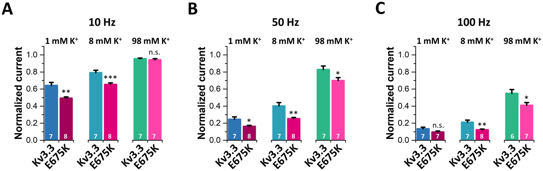 Figure 9. Analyses of the frequency-dependent accumulation of inactivation for Kv3.3 and Kv3.3E675K at different frequencies and [K+]ex. The data were analyzed from recordings illustrated in Figure 8. Relative current amplitudes after 10 s of pulsing at different [K+]ex (1 mM, 8 mM, 98 mM) at 10 Hz (A), 50 Hz (B) and 100 Hz (C). The current was normalized to the amplitude of the first pulse. Data are presented as mean ± s.e.m. The number of replicates is indicated within the graphs.