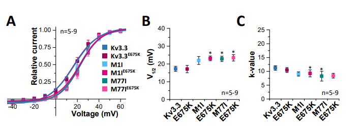 Kv3.3M1I/E675K variant. (A) Averaged current traces to illustrate the voltage-dependence of activation