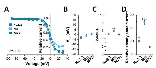 the k-values. (D) Analysis of the steady-state inactivation, plotting the sustained currents. Data are
