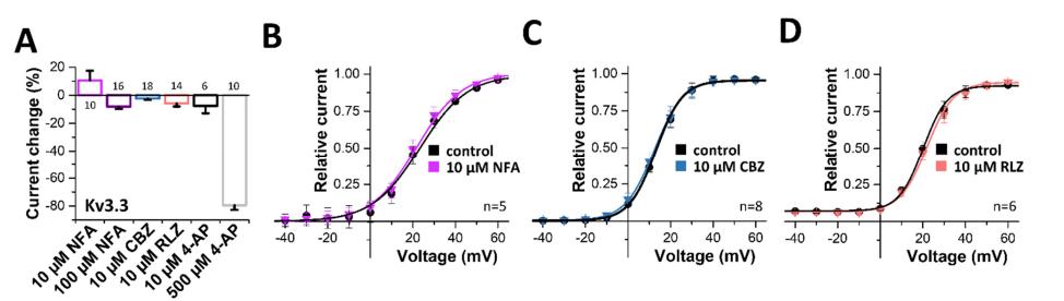 peak current changes of wild-type Kv3.3 by the application of niflumic acid (NFA), carbamazepine