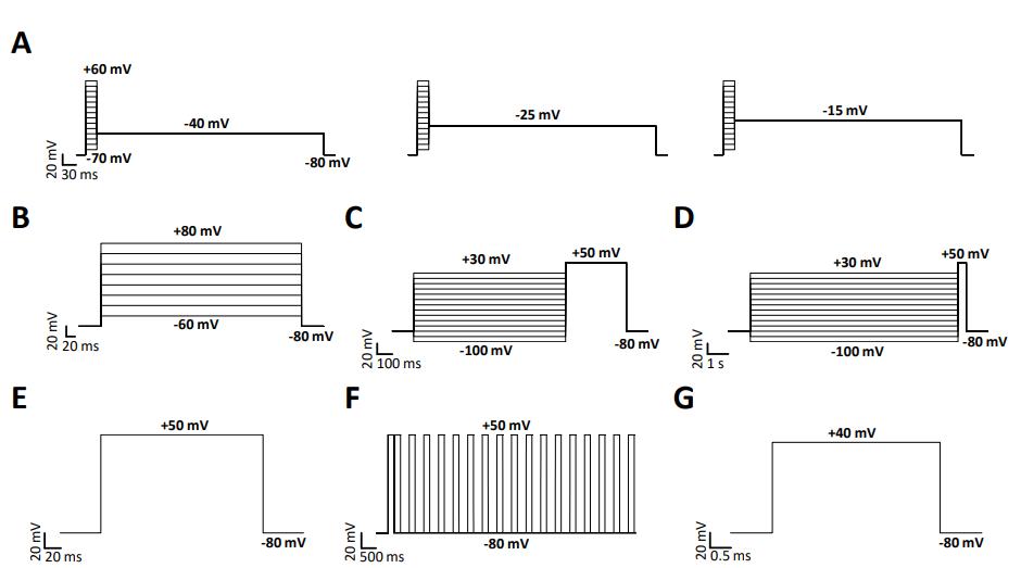 Supplementary Figure 5. Voltage protocols used for voltage clamp recordings to analyse (A) the