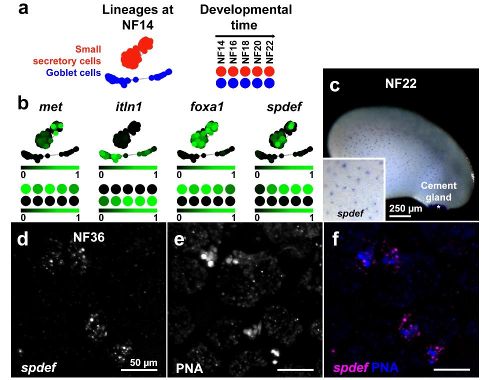 SSCs are a discrete epidermal cell type that express classical airway GC markers. (a–b) SSC (red) and GC (blue) lineage clusters in X. tropicalis embryos at NF14 and from NF14-22, are discrete (a) and marked by lineage-specific expression of met and itln1, respectively (b). The canonical goblet cell markers, foxa1 and spdef, are expressed almost exclusively in the SSC cell cluster at NF14, and over developmental time (b). Scale bars: colour intensity represents normalised expression level from undetectable (0) to maximum (1) within the dataset. c. Chromogenic in situ hybridisation for spdef at NF22 reveals punctate expression throughout the skin (inset), typical of SSC distribution, and strong expression in the cement gland (asterisk). (d–f) Fluorescent in situ hybridisation of spdef mRNA (d) and dual staining with PNA (e) confirms that spdef is expressed in SSCs (merged in f).