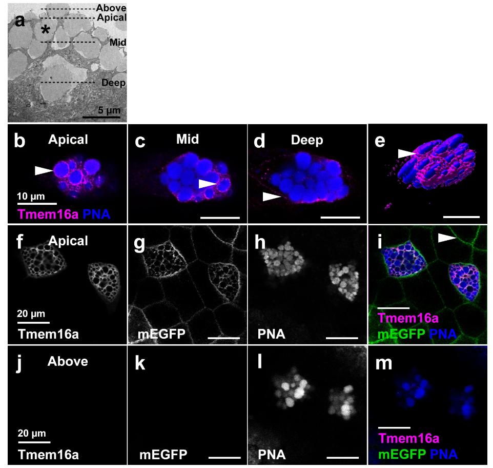 Fig. 3Tmem16a localises to the plasma and not vesicle membrane in SSCs. (a) SEM of SSCs reveals the presence of large vesicles (example indicated by asterisk) that bulge beyond the apical cell membrane of SSCs. Dashed lines indicate the planes of view in (b–m). (b–e) Immunofluorescent localisation of Tmem16a protein in apical, mid and basal planes of a single SSC reveals Tmem16a is present in a pattern that, in the apical (b) and mid (c) planes, appears to surround the PNA-positive secretory vesicles regions of cell (arrowheads). However, this localisation pattern is absent around vesicles in the more basal region of the cell (d), and expression becomes evident in the presumed plasma membrane (d, arrowhead). 3D surface rendering shows Tmem16a at an apical plane below that of the bulging vesicles (e). (f-i) In the apical plane of epidermal cells, Tmem16a (f) localises with mEGFP (g) in SSCs stained with PNA (h; merged in i), but does not localise with mEGFP marking the plasma membrane of other cell types (h, arrowhead). (j–m) Above the plane of epidermal cells, Tmem16a (j) and mEGFP (k) immunofluorescence is absent from bulging PNA-positive secretory vesicles (l; merged in m), demonstrating that Tmem16a is absent from the secretory vesicle membrane.