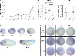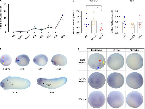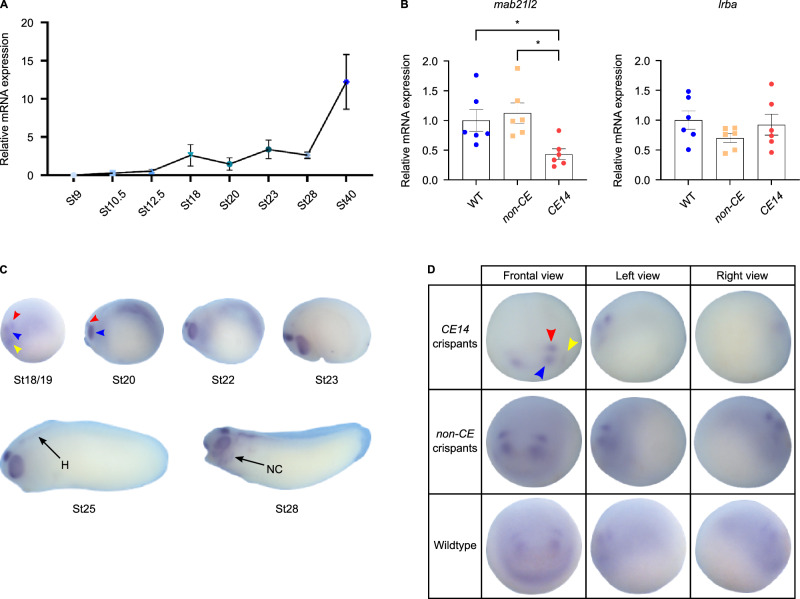 Fig. 4. Expression studies of mab21l2 in wild-type, CE14 and non-CE crispant Xenopus tropicalis.A Quantitative RT-PCR analysis showing mab21l2 expression levels in wild-type animals through different developmental stages: NF st9 (n = 6), st10.5 (n = 6), st12.5 (n = 6), st18 (n = 5), st20 (n = 5), st23 (n = 6), st28 (n = 6) and st40 (n = 5). Each data point represents mean ± SD. B Histograms demonstrating significantly reduced expression of mab21l2 mRNA in mab21l2-CE14 crispants compared with both non-CE crispants and wild-type embryos at NF stage 20 (CE14 versus non-CE: p = 0.0166, n = 6; CE14 versus wild-type: p = 0.0499, n = 6). In contrast, lrba expression was not affected (CE14 versus non-CE: p = 0.5211, n = 6; CE14 versus wild-type p = 0.3164, n = 6). For both genes, statistical significance was determined using one-way ANOVA followed by Tukey’s post-test. Bars represent mean ± SEM; *p ≤ 0.05. C Whole mount in situ hybridisation throughout different developmental stages in wild-type animals showing mab21l2 mRNA expression in the optic field (blue arrowhead), the lens placode (yellow arrowhead) and a region in the midbrain (red arrowhead). Expression becomes apparent in the hindbrain (H) and the migrating neural crest cells (NC) later in development. Embryos are shown in a lateral view, anterior to the left. D In situ hybridisation showing expression of mab21l2 mRNA in wild-type and crispant embryos at NF stage 18/19. Crispant embryos were injected at the 2-cell stage unilaterally on the right with mab21l2-CE14 or non-CE gRNAs. Frontal, left and right views are depicted, with the left view representing the uninjected side. Patterns of mab21l2 expression in the optic vesicle, lens placode or midbrain (blue, yellow and red arrowheads) are absent or reduced on the injected side for mab21l2-CE14 crispants (upper panel) compared to non-CE crispants (middle panel) and wild-type (lower panel). Source data for panels 4A and 4B are provided in the Source Data file.