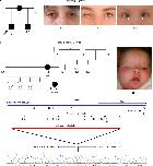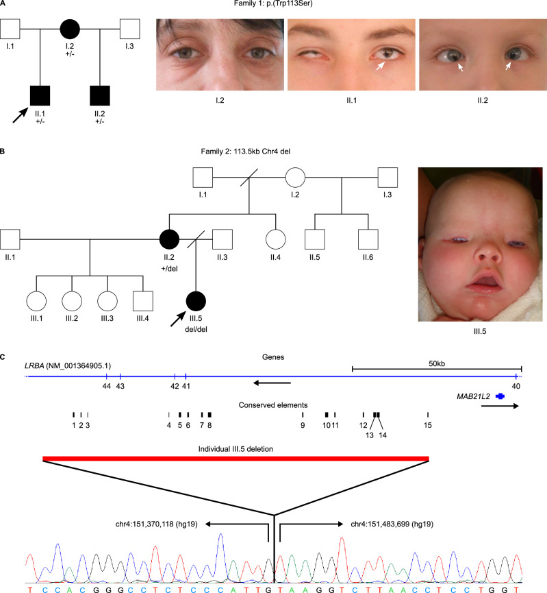 Fig. 1. MAB21L2 variants in individuals with bilateral microphthalmia, including the genomic context of the deletion identified in Family 2.A Pedigree and phenotypic images of the eyes of affected members of Family 1. The proband (II.1, black arrow) shows bilateral microphthalmia and iris coloboma (and has choroid and retinal coloboma, right cataract and left aphakia). His half-brother (II.2) shows bilateral iris coloboma (and has choroid and retinal colobomas, with nystagmus). Their mother (I.2) has a normal external eye appearance (with a small unilateral optic disc coloboma). All three individuals are heterozygous for the missense variant MAB21L2 p.(Trp113Ser). B Pedigree of Family 2. The proband (III.5, black arrow) presented with bilateral microphthalmia (wearing early socket expanders in the photo), orbital cysts and microcephaly. A short upturned nose and prominent philtral pillars can be seen. Her mother (II.2) had very subtle bilateral central anterior lens suture opacities; her father was unavailable. III.5 is homozygous for an ~ 113.5 kb deletion ~ 19 kb upstream of MAB21L2, inherited from her heterozygous mother. C Schematic image of the deleted region identified in Family 2 showing relative positions of LRBA and MAB21L2 (blue, with LRBA exon numbers indicated underneath), evolutionary non-coding conserved elements (CEs) within the deleted region, CNV location (red) and Sanger sequencing of proband demonstrating the breakpoints (sequencing of the breakpoint was performed for the negative strand only, for clarity the chromatogram shown is the reverse complement). CEs 7 and 8 contain the regulatory sequences Ma and Mb, respectively, identified by Tsang et al. 28.