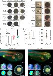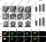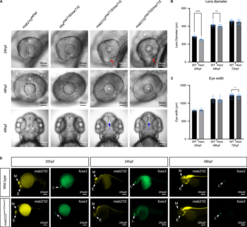 mab21l2 (yellow) and foxe3 (green) mRNA expression in whole mount wild-type and homozygous mab21l2mw715 fish. White arrows indicate the position of the midbrain (M), eye (E), and lens (L): the mutants exhibited a visibly reduced mab21l2 expression in the midbrain region, and a slightly reduced mab21l2 staining in the eyes at 20- and 24hpf; foxe3 expression (green) in the developing lens was detected at all stages, showing a smaller lens in 20- and 24hpf mutant embryos. Panels (B and C): Black bars: wild-type; greyscale bars: homozygous mab21l2mw715 embryos (24hpf: medium grey; 48hpf: grey; 72hpf: dark grey); * p ≤ 0.05, ** p ≤ 0.01, ***p ≤ 0.001, ****p ≤ 0.0001. Source data is provided in the Source Data file.