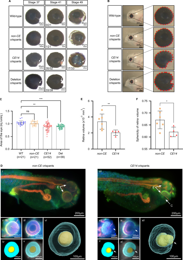 Fig. 3. Characterisation of eye size and morphology in Xenopus tropicalis mab21l2 crispant embryos.A Eye phenotypes in wild type (WT) and mab21l2 crispant embryos throughout different developmental stages demonstrating colobomas (abnormal choroid fissure closure; white arrows) in CE14 and deletion crispants. The number of animals showing the abnormal choroid fissure phenotype is indicated. B Outline of the circumference of the eyes (dashed red line) on the injected side of the tadpoles (NF stage 41) indicating the presence of coloboma in CE14 and deletion crispants. C Histogram depicting relative eye size evaluated for individual embryos of wild-type (n = 21), mab21l2-non-CE (n = 21), CE14 (n = 52) and 5’del (n = 39) crispants via 2D measurements of the eye circumference. The ratio of the injected side versus the non-injected side of each group demonstrates a significant reduction in eye size on the injected side of CE14 (p = 0.0013) and deletion crispants (p = 0.0007) compared to WT, while non-CE has a similar ratio (p = 0.7274). Statistical comparison of the eye size ratio, using data from three independent injections, was conducted using a randomised block experiment analysis in GraphPad Prism. Subsequently, mixed-effects analysis followed by Tukey’s post-test was employed to compare different experimental groups to the WT ratio. D 2D and 3D phenotyping of mab21l2-CE14 and mab21l2-non-CE crispants. mesoSPIM light-sheet microscopy in toto imaging of a mab21l2-non-CE (i) and CE14 (vii) embryo stained for PNA-Lectin (blue), WGA-Lectin (green) and Atp1a1 (red) showing coloboma in CE14 crispants (abbreviations: C = coloboma, E = eye). Multiclass U-Net for segmentation of retina (cyan) and lens (yellow) are shown (ii-v, viii-xi), together with three-dimensional U-Net reconstructions (vi, xii) revealing aberrant retinal morphology, coloboma and malformed lens in CE14 crispants (xii) (white arrows). E, F Histograms showing quantification of U-Net reconstructions of retina volume (E) and sphericity (F), revealing a significant reduction of both parameters in mab21l2-CE14 crispant eyes (n = 4) compared to non-CE crispant eyes (n = 6). Statistical significance was determined using a non-parametric two-sided Mann-Whitney U test for the retina volume (p = 0.0095) and a two-sided unpaired t test for sphericity (p = 0.0409). Panels (C, E and F): Data are presented as mean ± SD; ns: not significant, *p ≤ 0.05, **p ≤ 0.01, ***p ≤ 0.001. Source data provided in the Source Data file.