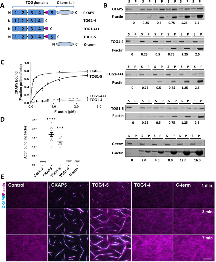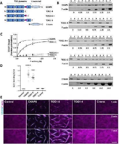 FIGURE 1:. The TOG5 domain is necessary for direct interaction with F-actin in vitro. (A) Diagram of CKAP5 and deletion proteins used in F-actin sedimentation and in vitro TIRF assays. (B) SDS–PAGE showing levels of CKAP5 and TOG domain proteins in supernatant (S) and pellet (P) following sedimentation with F-actin. CKAP5, TOG1-4, TOG1-4++, TOG1-5, and C-term domain proteins incubated with increasing amounts of F-actin protein. Sedimentation of C-term domain utilized high F-actin concentrations. (C) F-actin binding curves of CKAP5 and TOG domain proteins interacting with F-actin in sedimentation assays. CKAP5 bound F-actin is determined by the ratio of protein pelleted over total protein incubated with F-actin. (D) F-actin bundling factor of CKAP5 and TOG domain proteins. In vitro polymerized rhodamine-phalloidin stabilized F-actin was incubated in the presence of CKAP5 proteins. F-actin bundling factor by conditions were as follow, control: 0.18 ± 0.02, CKAP5: 1.68 ± 0.37, TOG1-5: 1.31 ± 0.22, TOG1-4: 0.21 ± 0.02, C-term: 0.21 ± 0.03 (mean ± st. dev.). (E) Representative time lapse TIRF images of F-actin bundling in the absence (control) or in the presence of mNG-CKAP5 or TOG domain proteins. Magenta: F-actin, cyan: CKAP5 proteins. Scale bar: 20 µm.